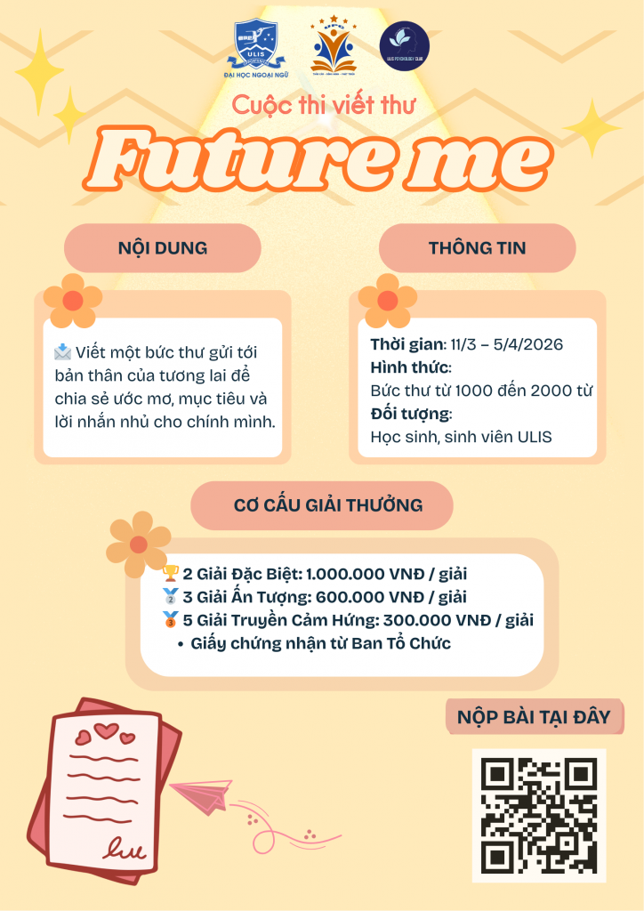 Nhằm góp phần hỗ trợ sinh viên xác định mục tiêu học tập, định hướng nghề nghiệp và phát triển bản thân trong bối cảnh xã hội nhiều biến động, Bộ phận Tư vấn và Phát triển cá nhân (UPC) trực thuộc Khoa Tâm lý – Giáo dục khai phóng, Trường Đại học Ngoại ngữ – Đại học Quốc gia Hà Nội tổ chức cuộc thi “Future Me – Tương lai tôi” với hình thức viết thư gửi cho chính mình trong tương lai.